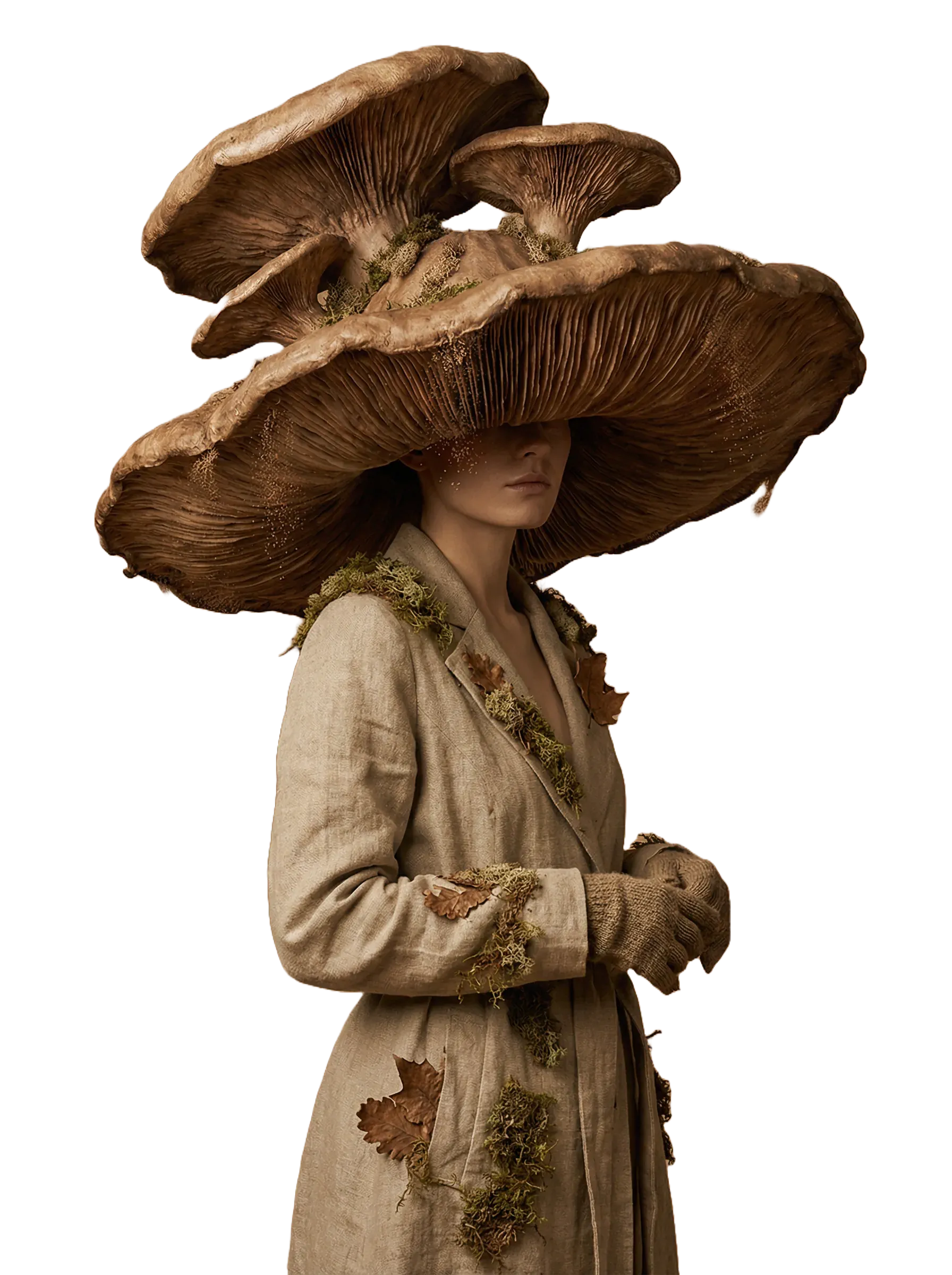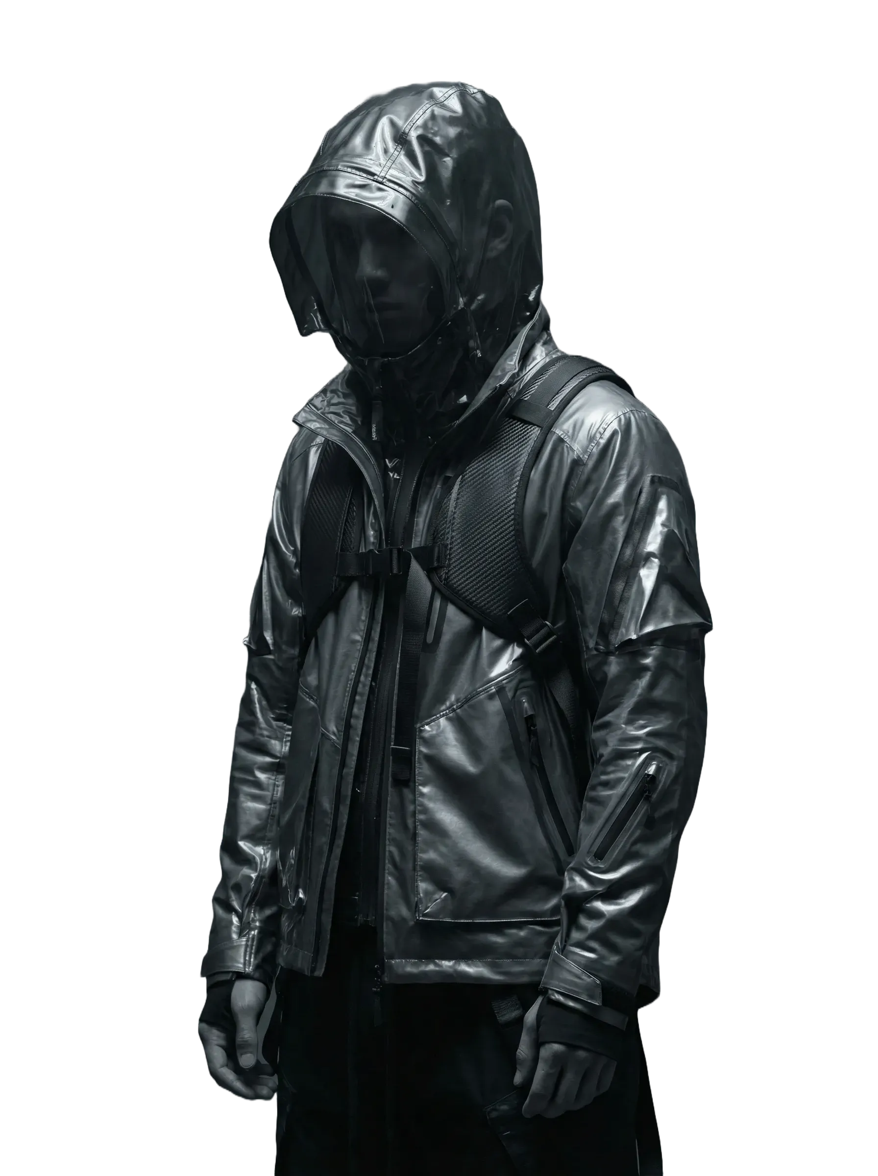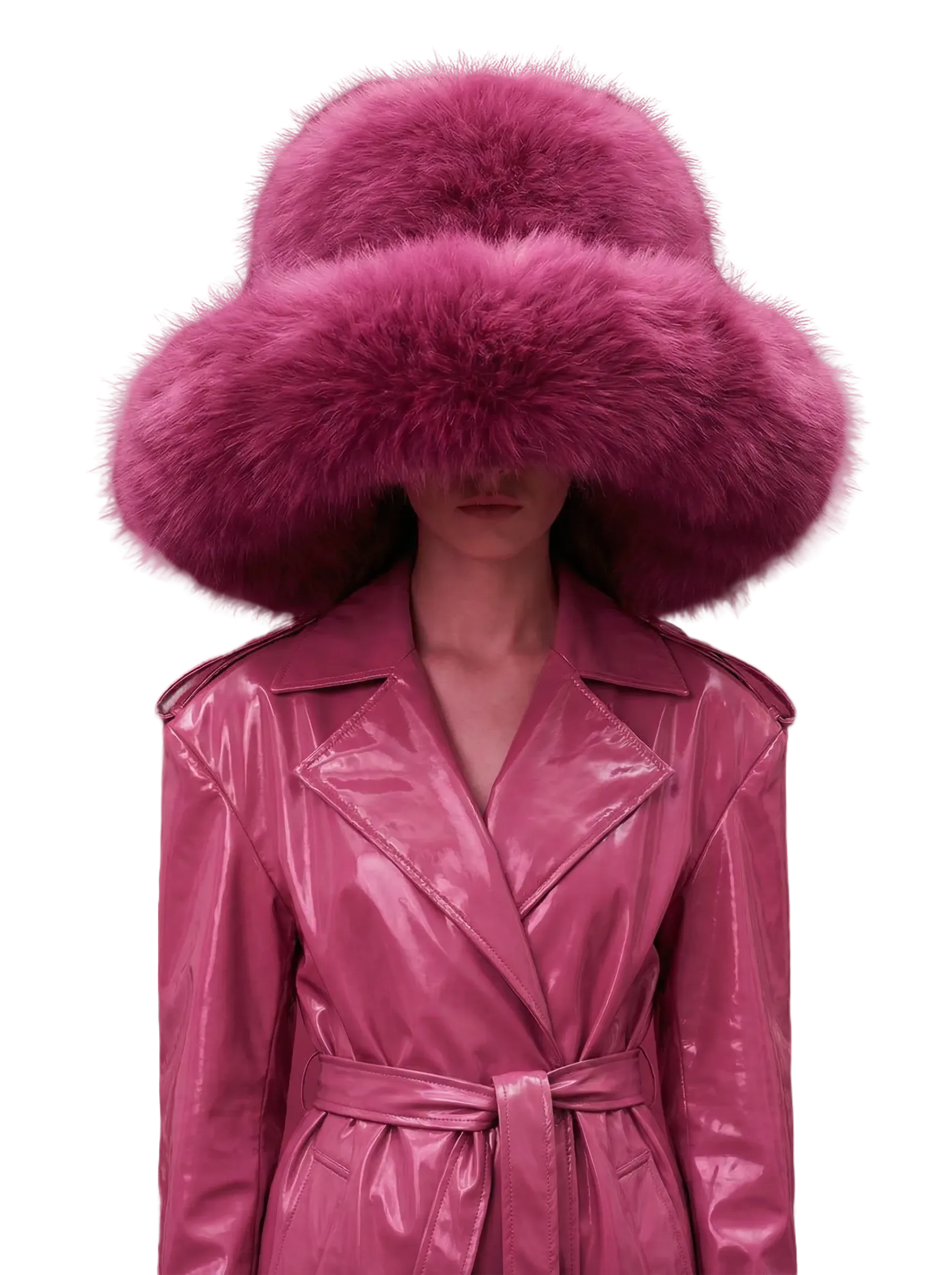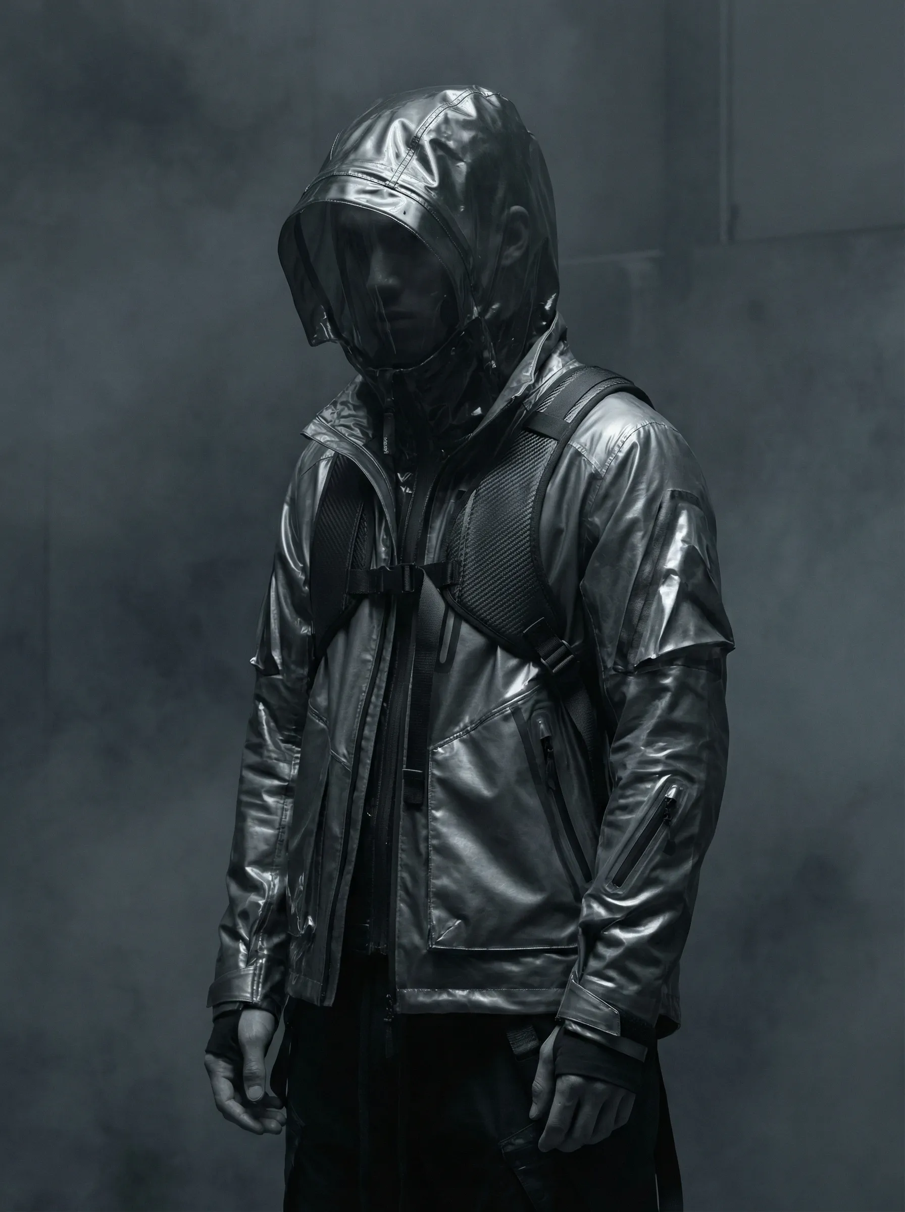 "Futuristic character in translucent magenta tech-wear, shrouded in a vibrant mist with subtle neural patterns."